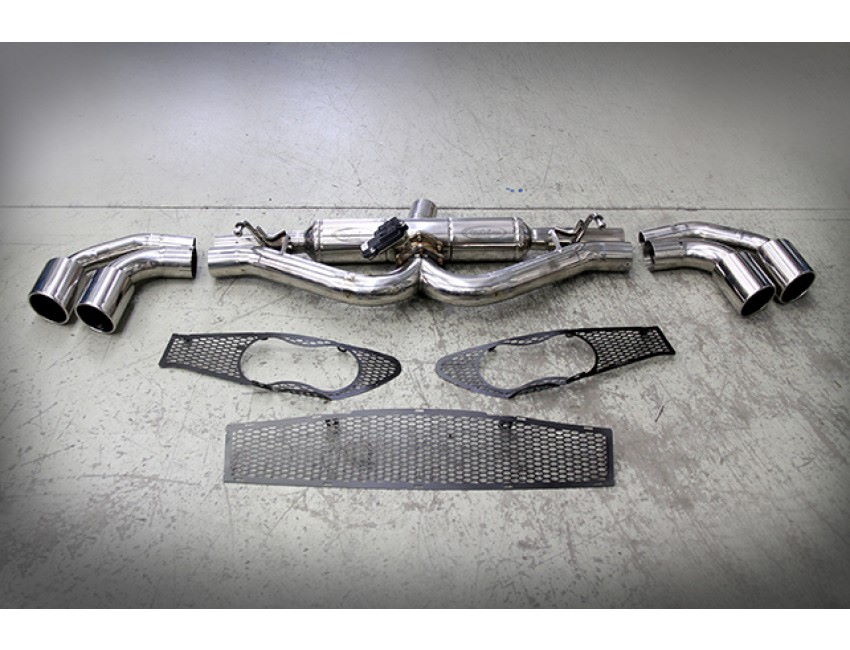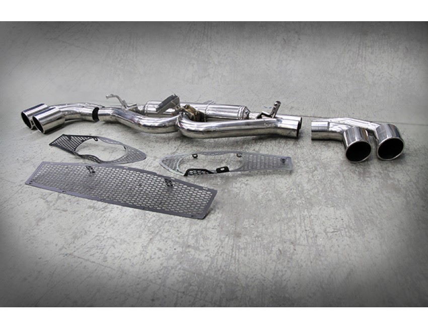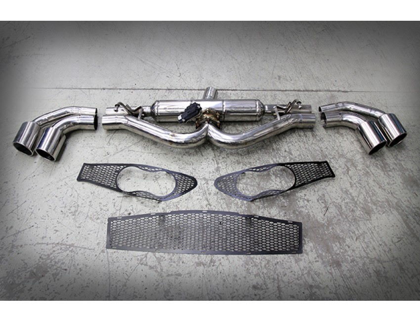 The exhaust kit includes the muffler with 4 outlet pipes, two on each side of the car, four polished end tips, the pipe with felxi that connects the muffler to the kat, and the ExCU with the electric valve, the bumper grids. The exhaust is TUV homologated and street legal.