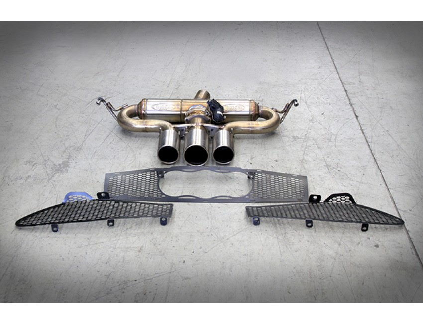 The exhaust kit includes the muffler with triple central polished end tips, the pipe with flexi that connects the muffler to the cat, and the ExCU with the electric valve, and the bumper grids.
